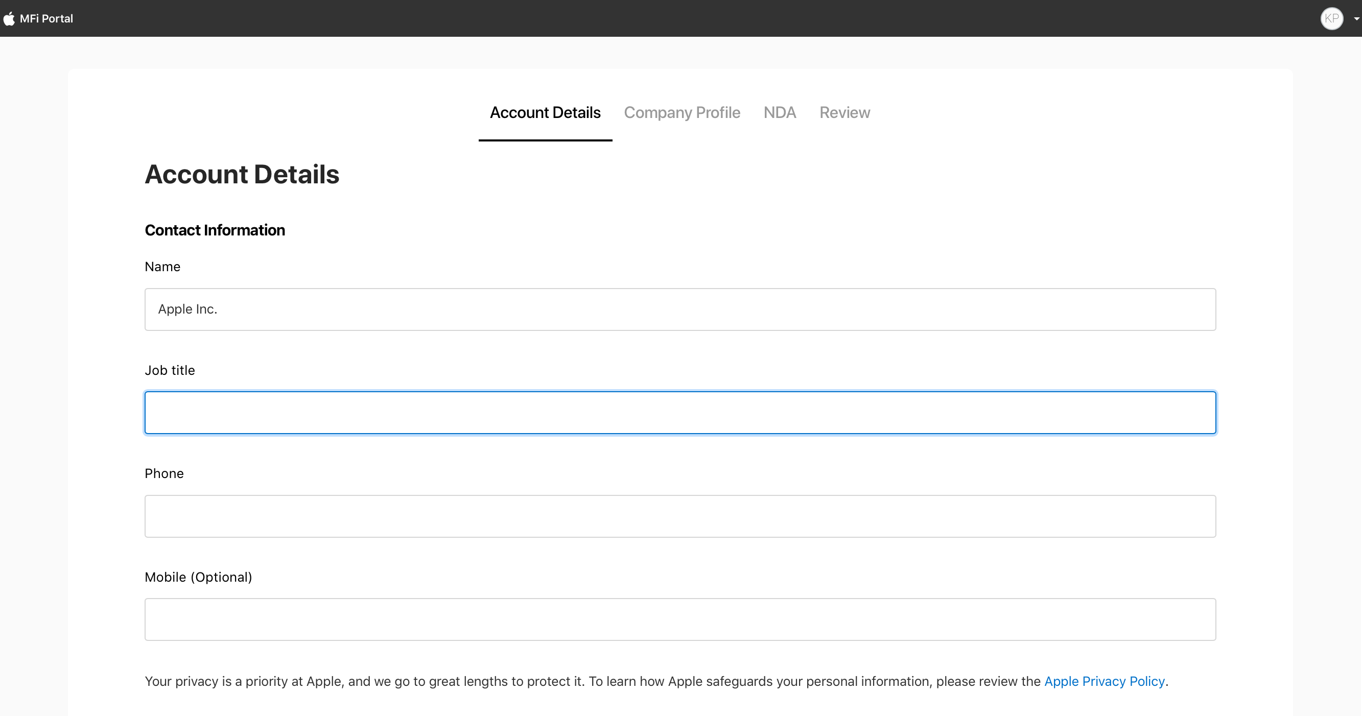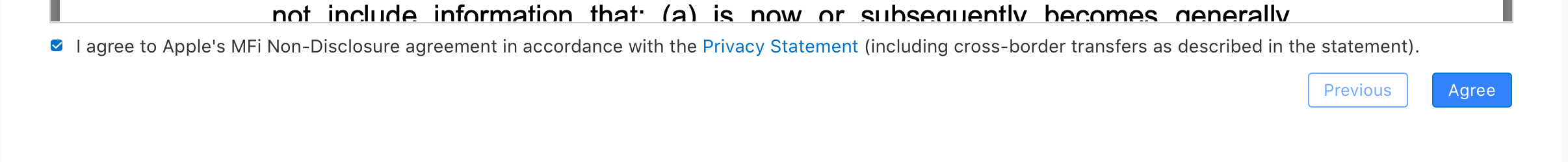 Read the Apple MFi Non-Disclosure Agreement and click the box next to the Privacy Statement agreement.