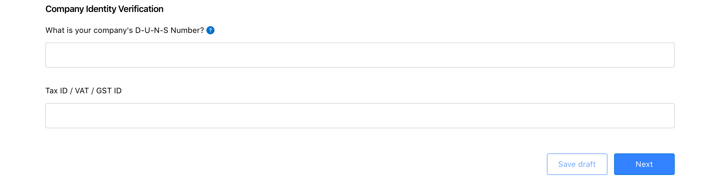 Enter your company's tax identification number. (This field only appears for certain applicants based on the location of your company. You will see a tax identification field if the country where your company is located requires that the information is entered.)