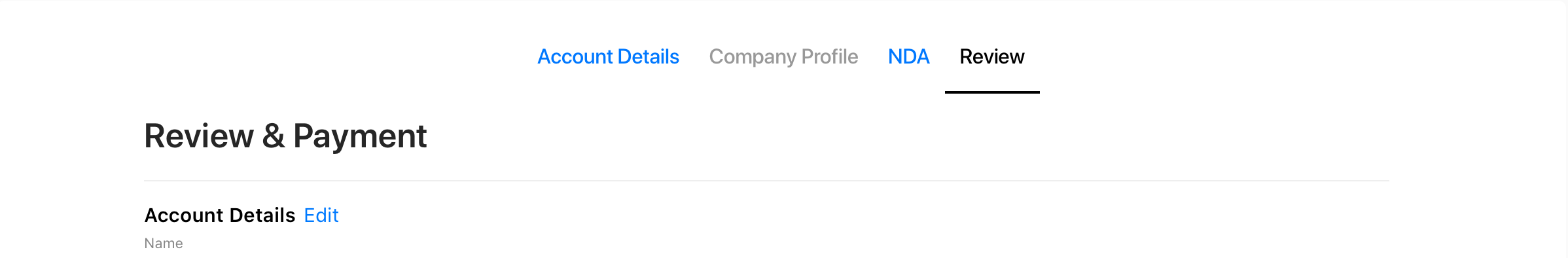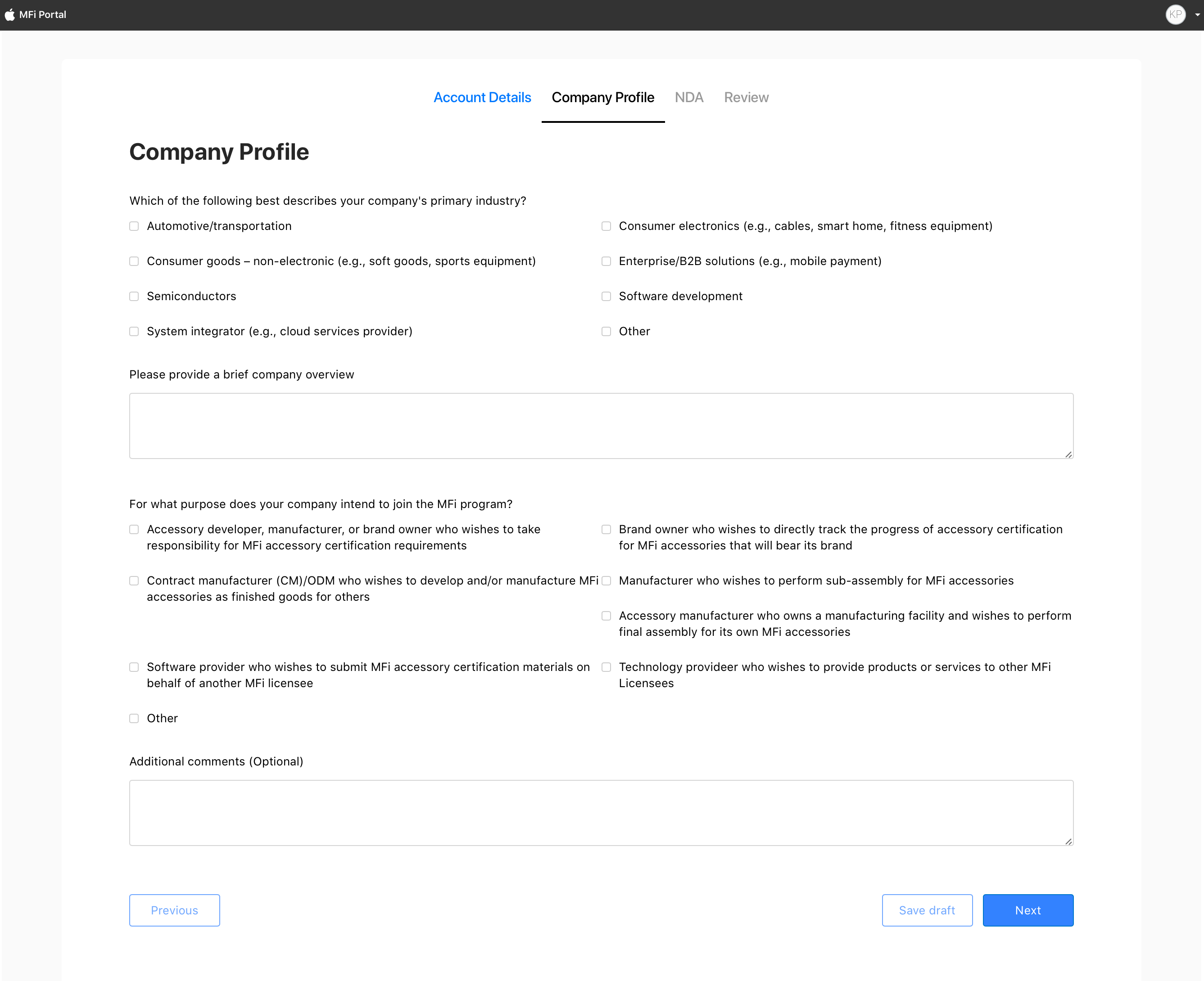 - Select "Previous" to return to the previous Company Profile page or select "Agree" to agree to the terms of the Apple MFi Non-Disclosure Agreement.