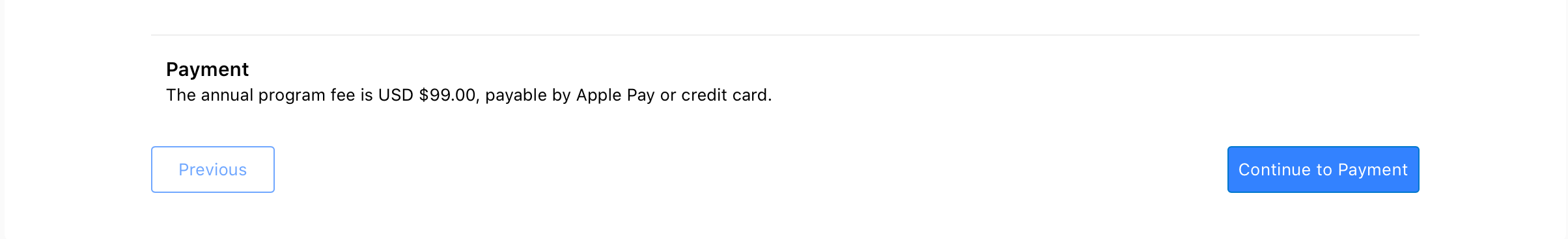 - The annual program fee is USD $99 (plus any necessary taxes or fees), payable by Apple Pay or credit card.